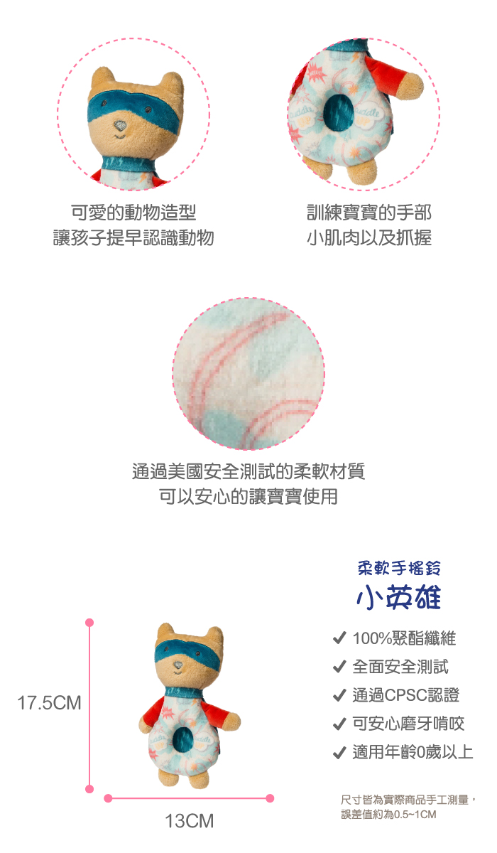 ●商品聲響設計,可刺激寶寶聽覺,亦適合寶寶手指動作練習。