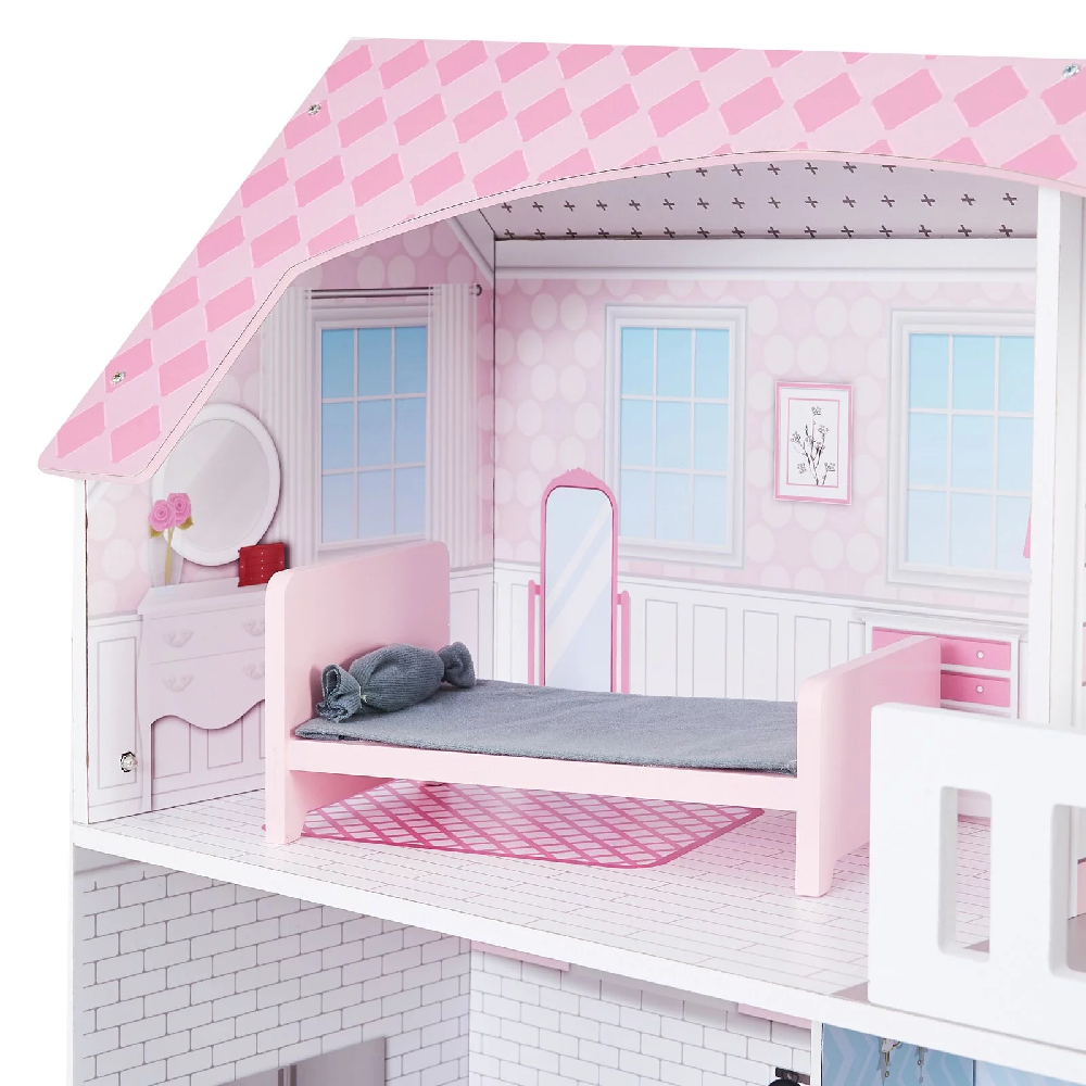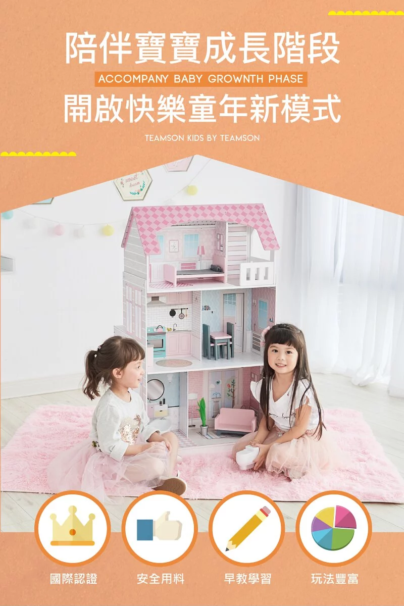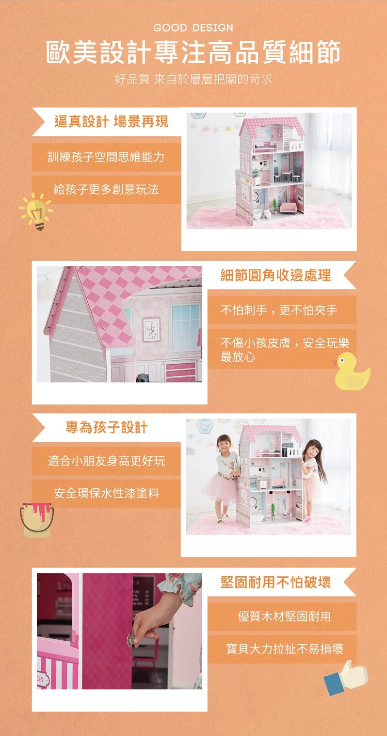 另一邊的娃娃屋共有三層,五間房加一個陽台,還有9件娃娃家具,以及一個有音效的馬桶。