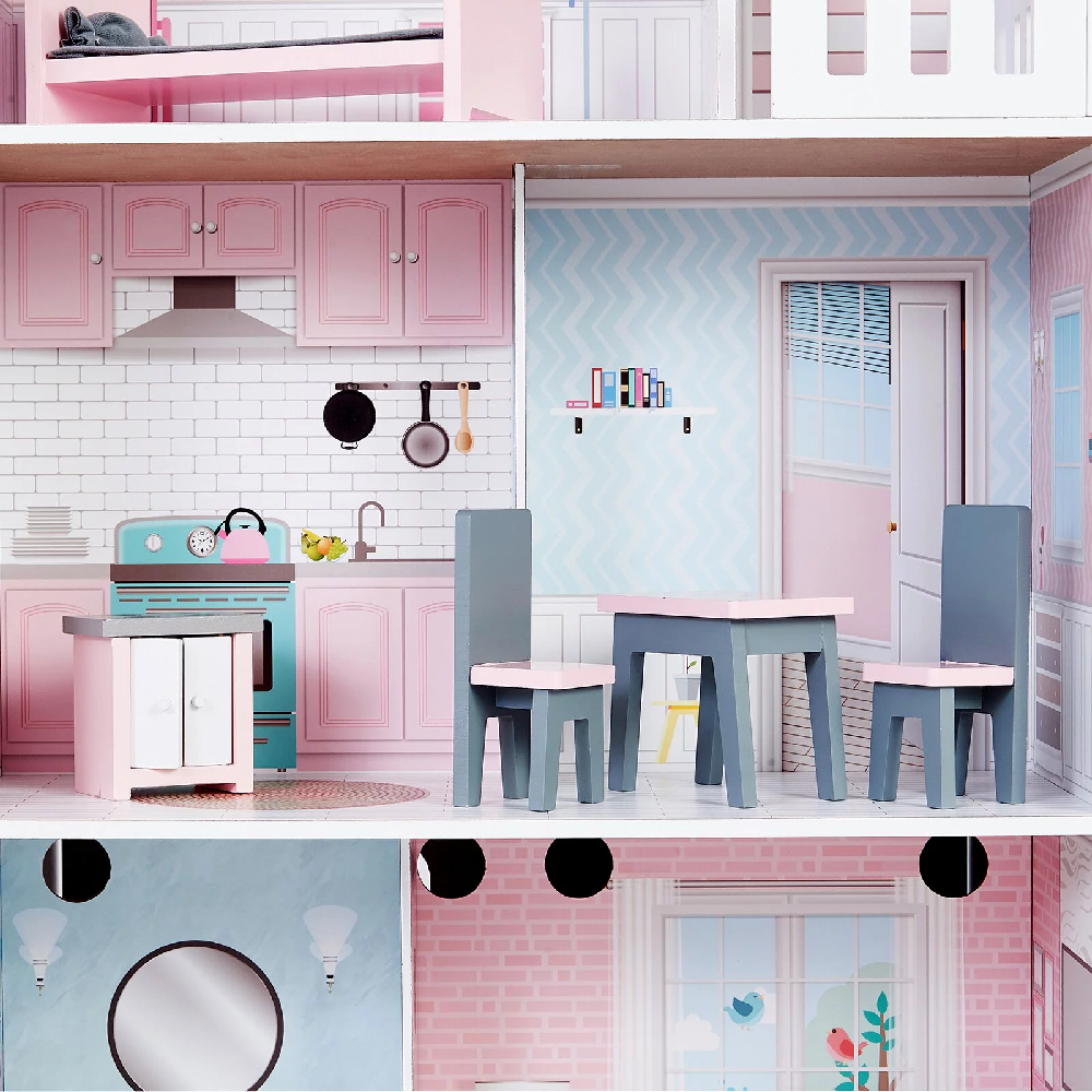 這個遊樂廚房和玩具屋採用柔和的灰色風格和粉紅色調設計,非常適合任何空間有限的臥室或遊樂區。