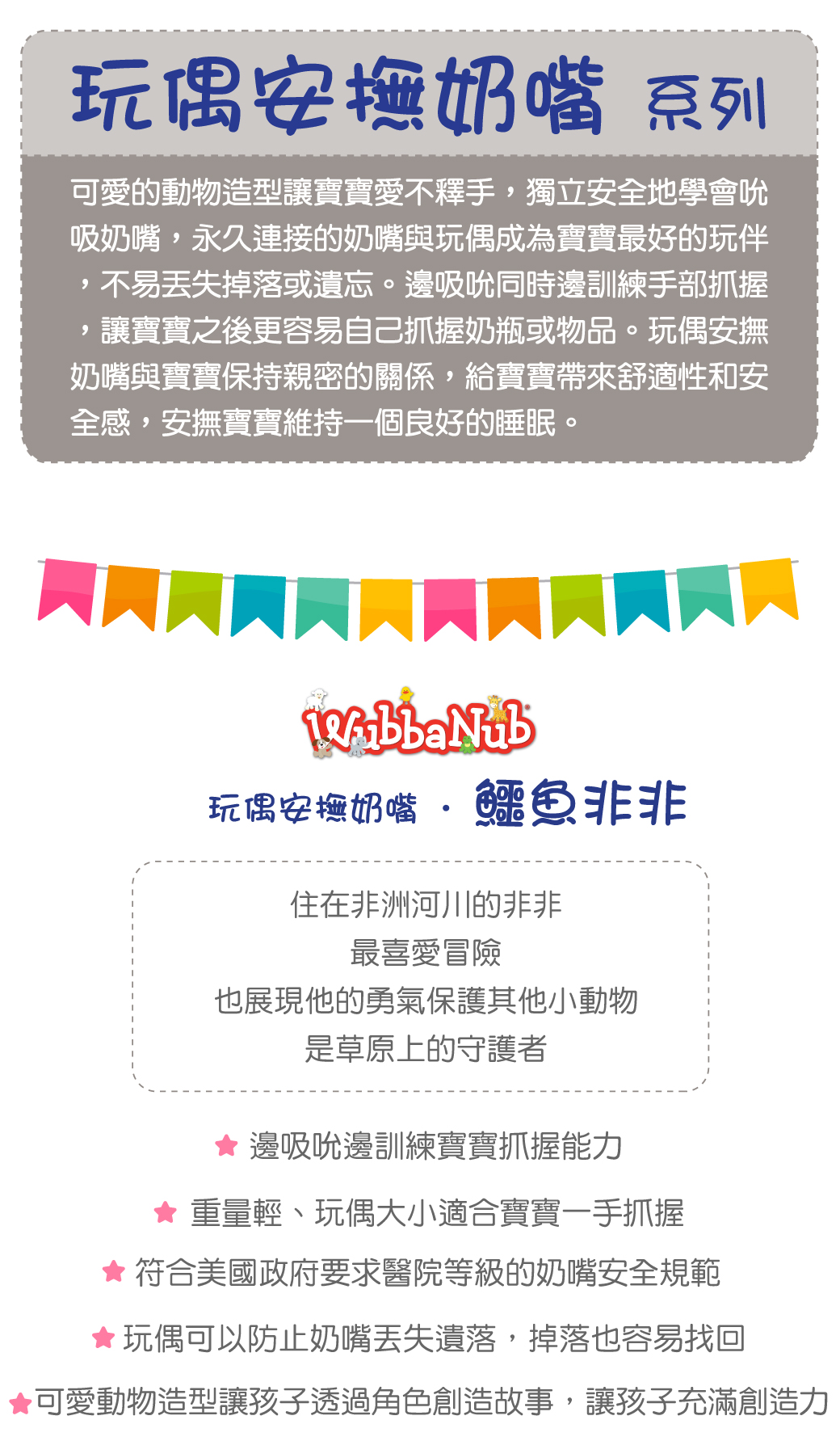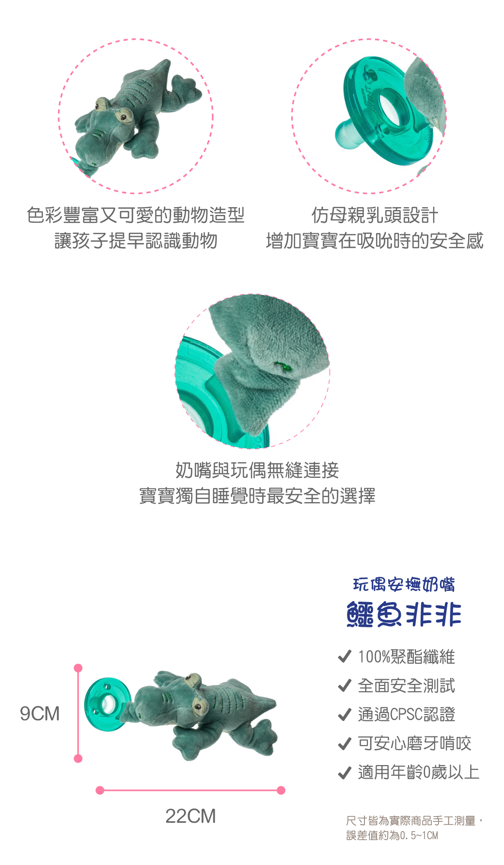 ●毛絨玩偶使寶寶容易掌握和拿取奶嘴,也讓奶嘴不容易掉落和遺失。