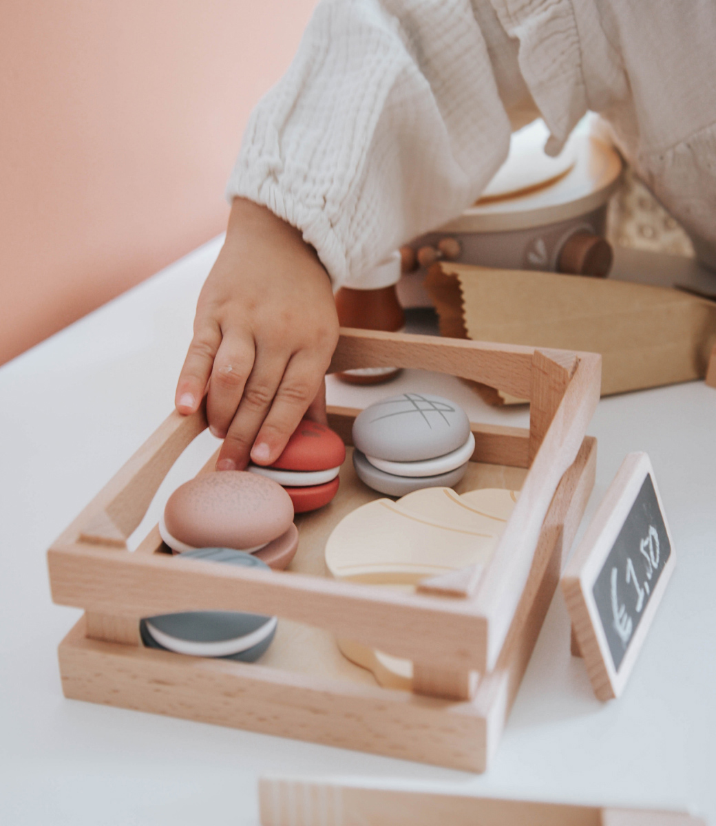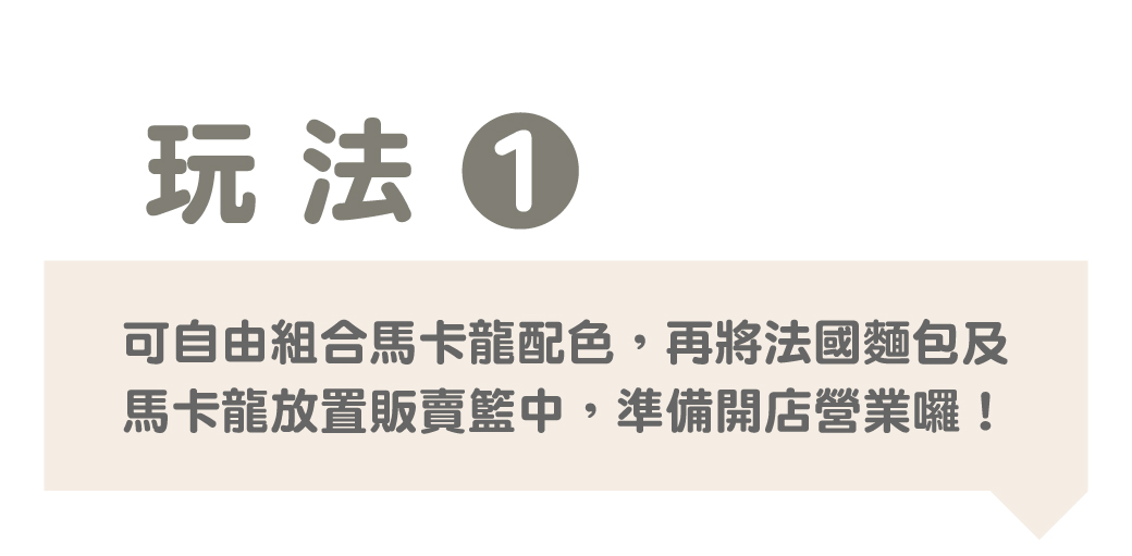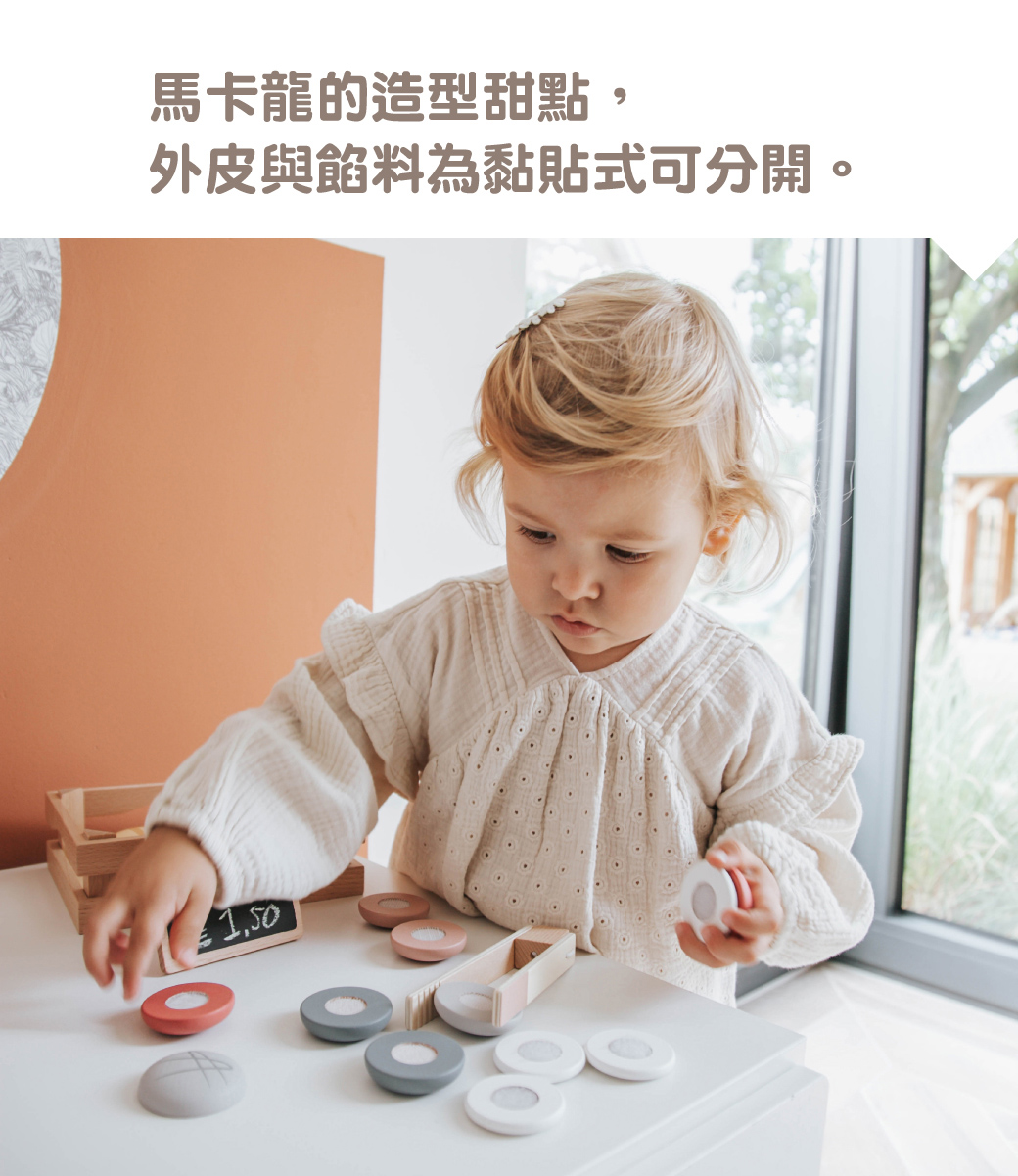 ●馬卡龍的造型甜點,外皮與餡料為黏貼式可分開,訓練手部小肌肉
