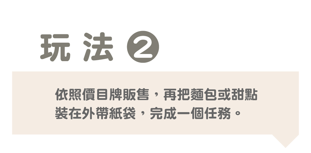 ●依照價目牌販售,再把麵包或甜點裝在外帶紙袋,完成一個任務