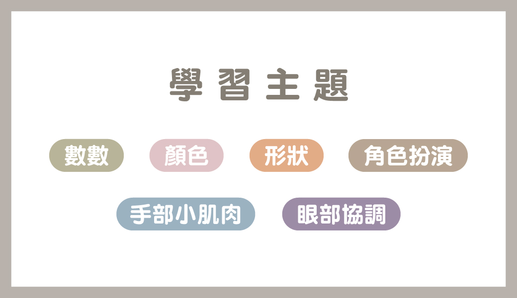 ●學習主題:眼部協調/手部小肌肉/形狀/數數/角色扮演/顏色