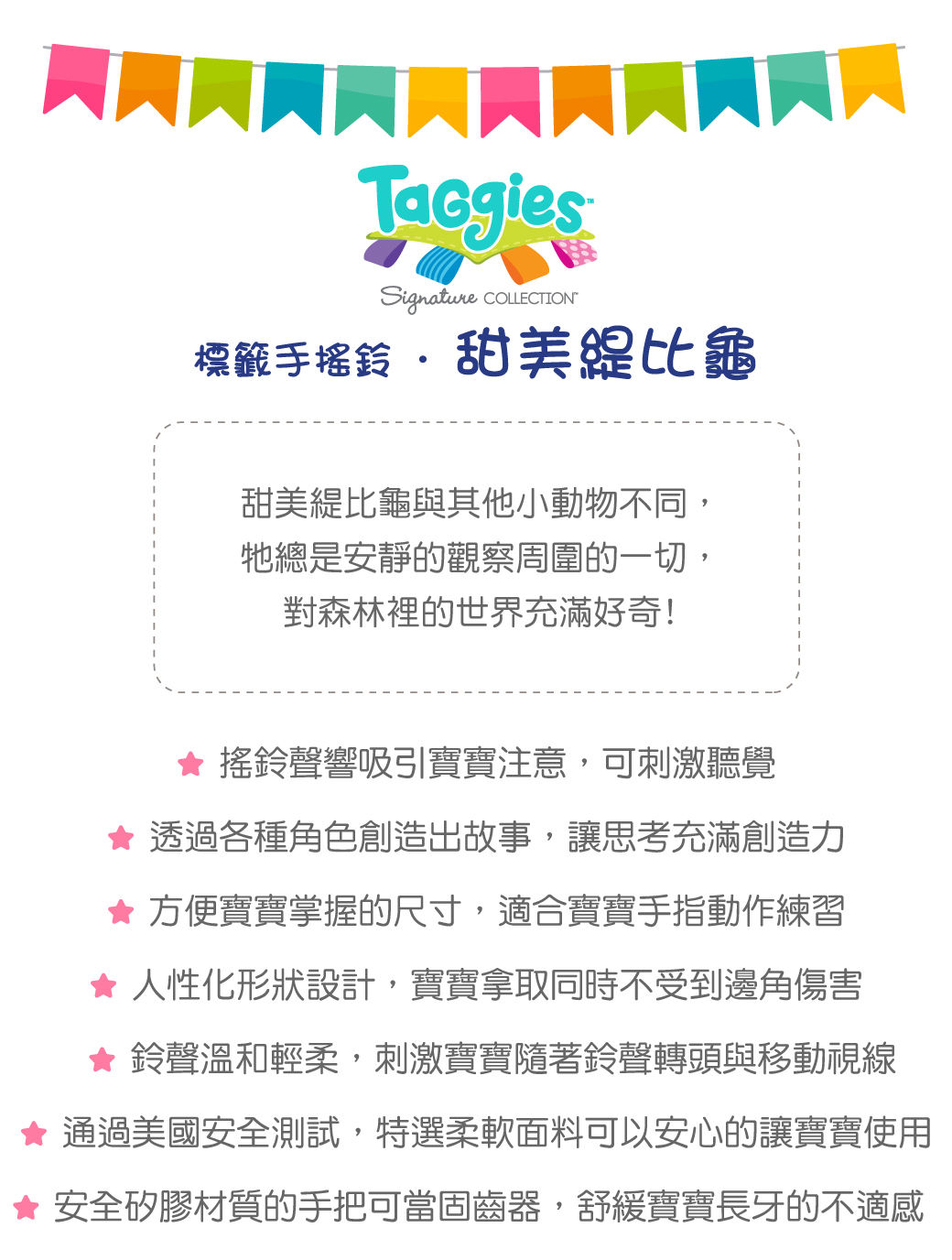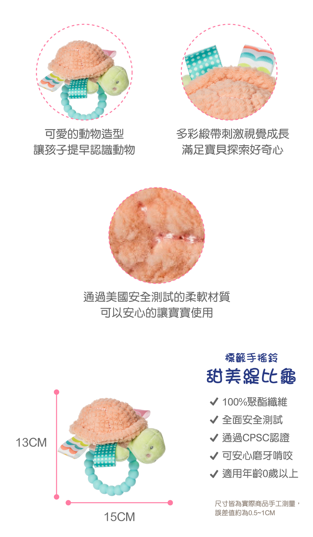 ●商品聲響設計,可刺激寶寶聽覺,亦適合寶寶手指動作練習