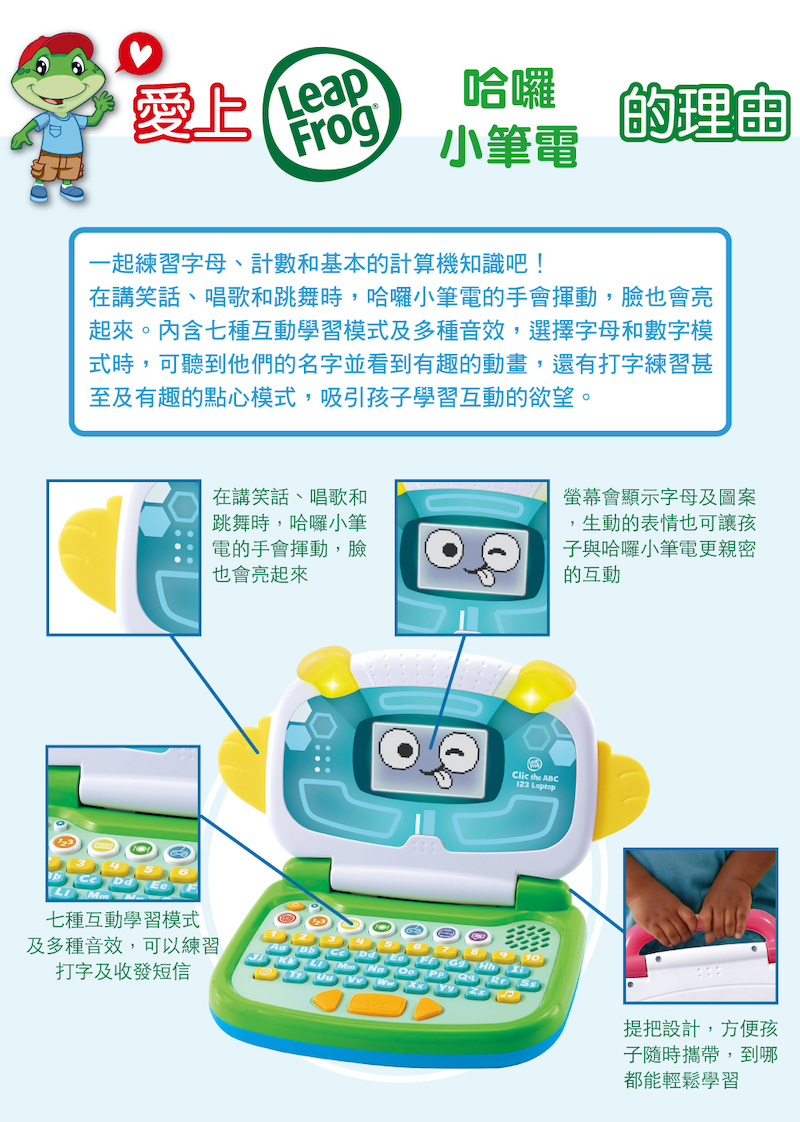 *揮動小手及發亮臉部設計,吸引孩子注意