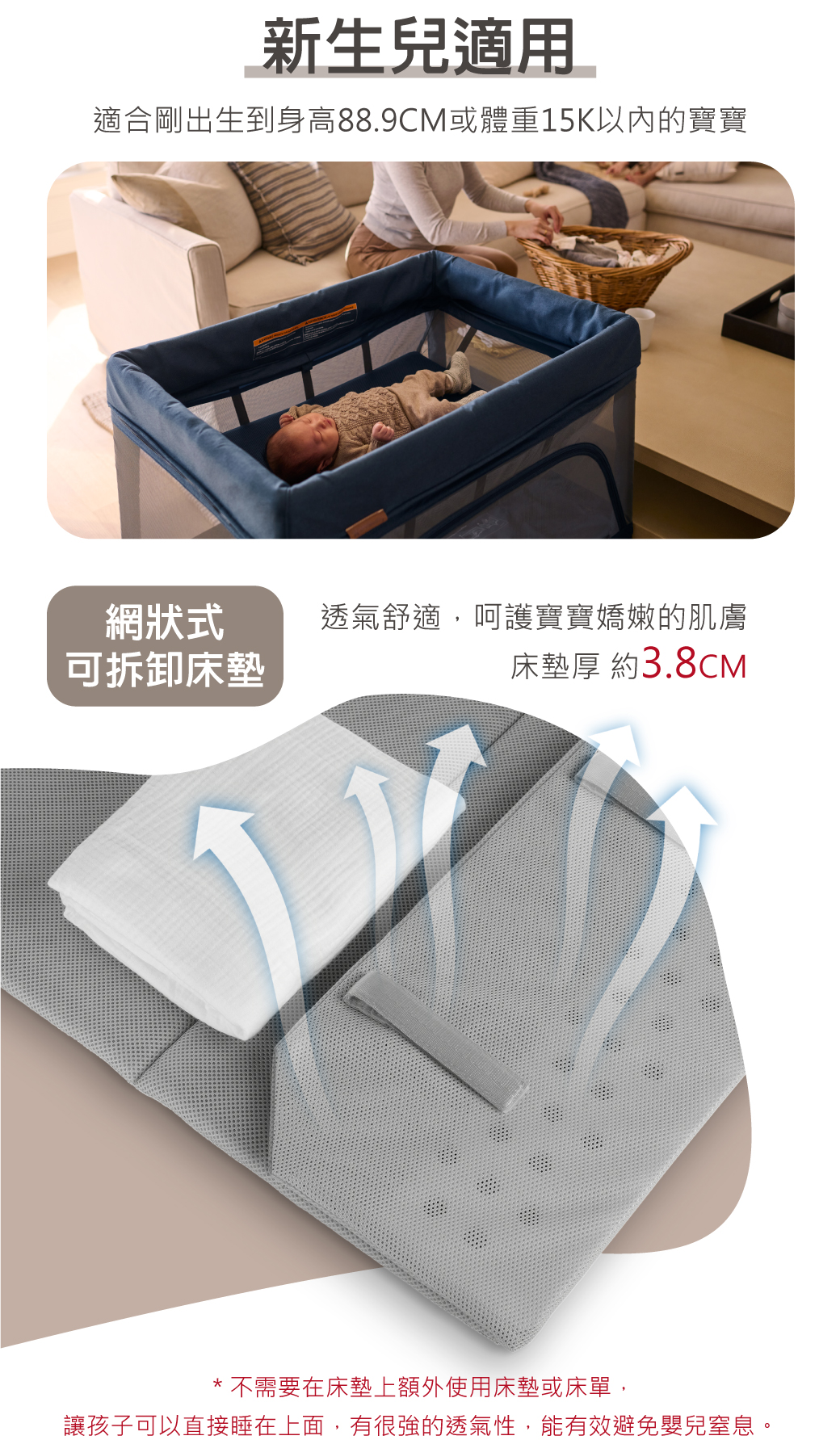 ●上層為可拆卸拉鍊式設計睡床,適合新生兒使用,