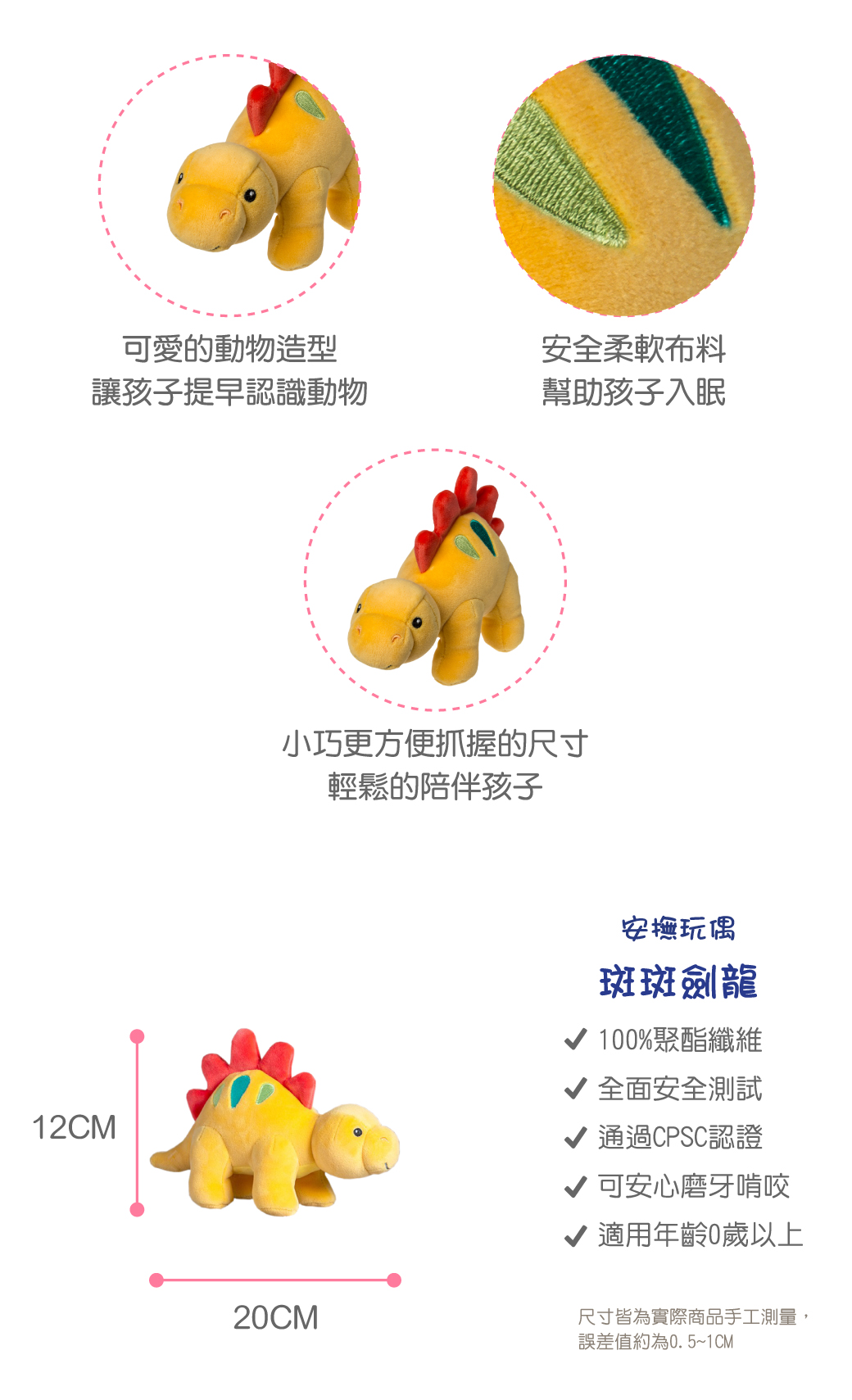 ●活潑鮮豔的配色,及刺繡的眼睛和五官細節,吸引寶寶的注意力