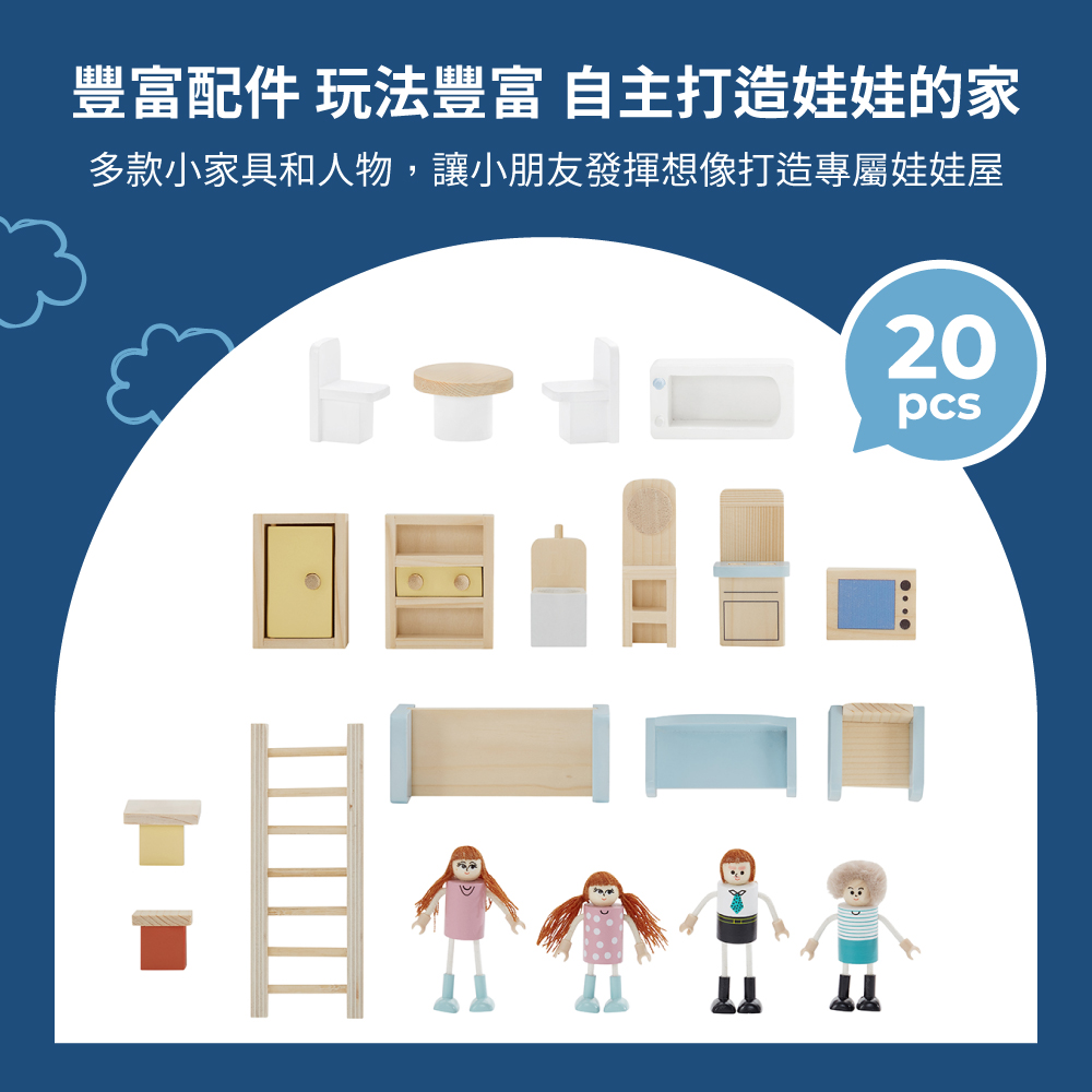 .內容物:手提屋x1、櫥櫃x1、衣櫃x1、爐台x1、梳妝台x1、茶几x1、凳子x2、浴缸x1、馬桶x1、床x1、桌子x1、椅子x2、長沙發x1、小沙發x1、樓梯x1、玩偶x4