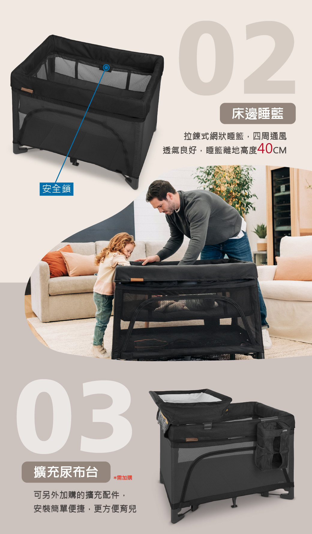 ●上層為可拆卸拉鍊式設計睡床,適合新生兒使用,也可以當床邊床。
