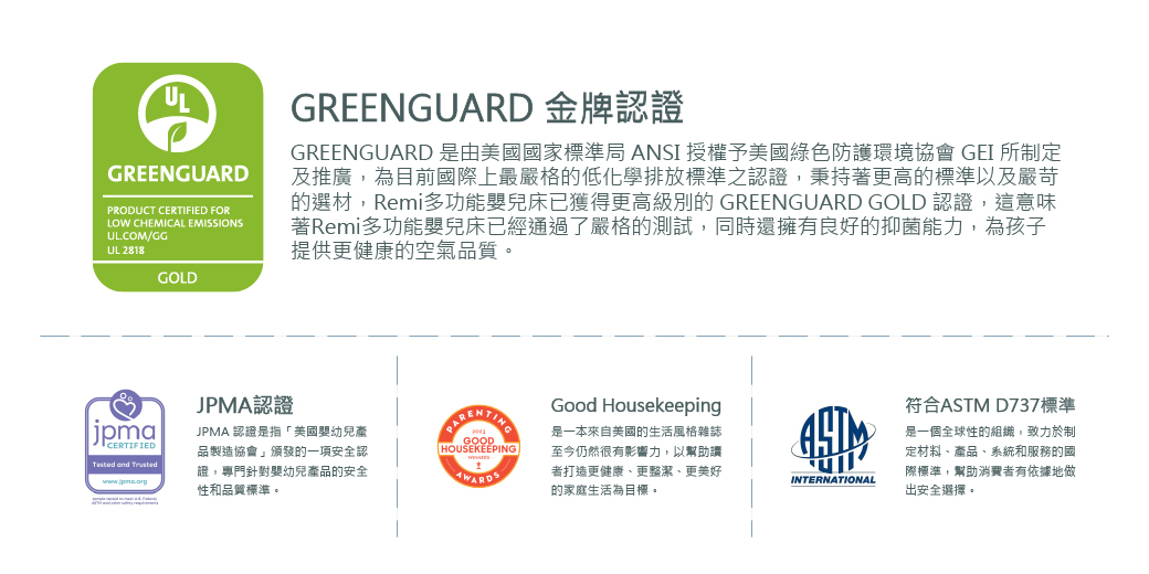 ●通過GREENGUARD綠色環保金牌、JPMA、Good Housekeeping三重認證。