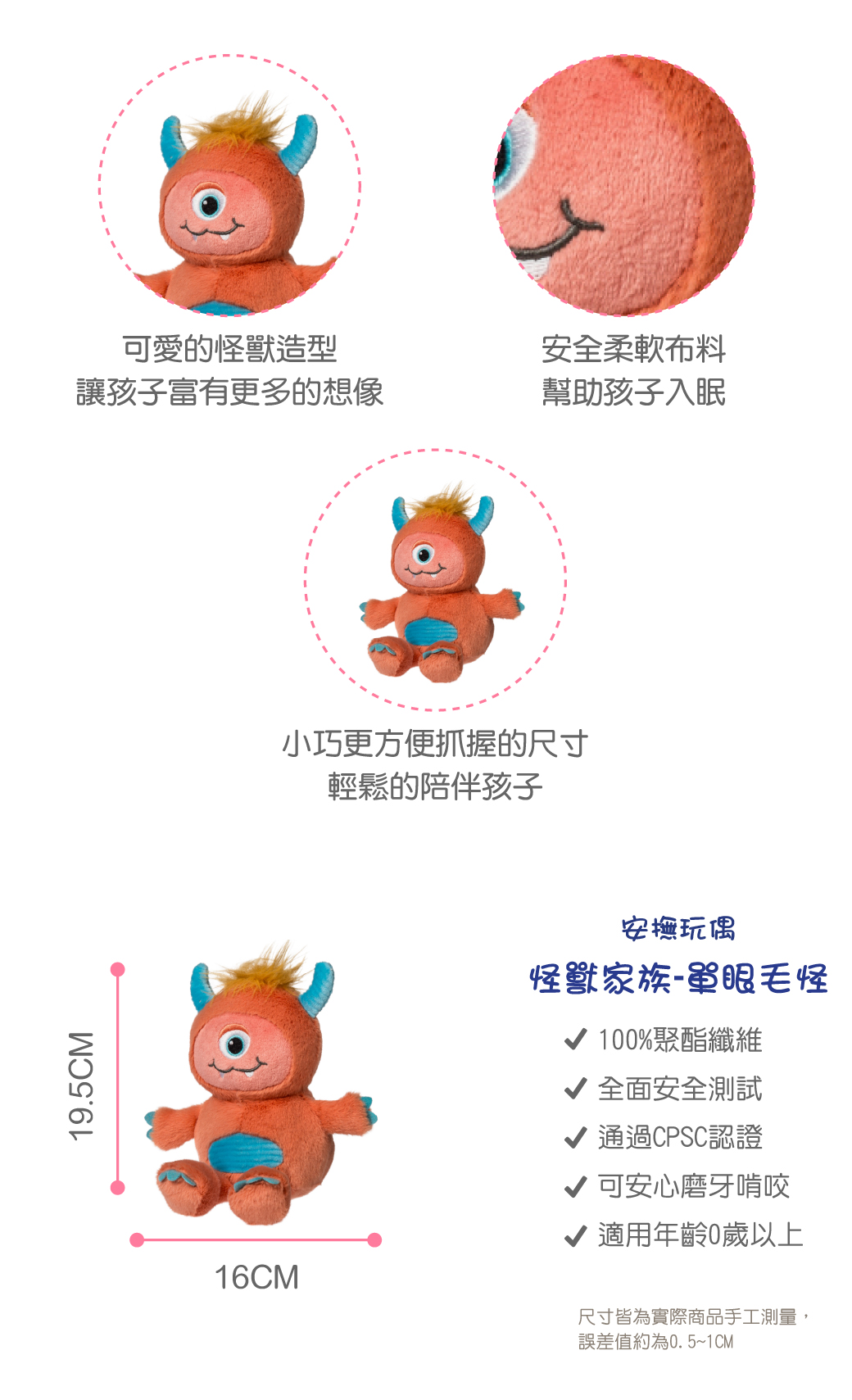 ●活潑鮮豔的配色,及刺繡的五官細節,吸引寶寶的注意力