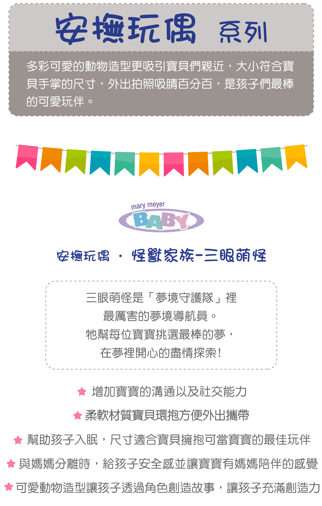●活潑鮮豔的配色,及刺繡的五官細節,吸引寶寶的注意力