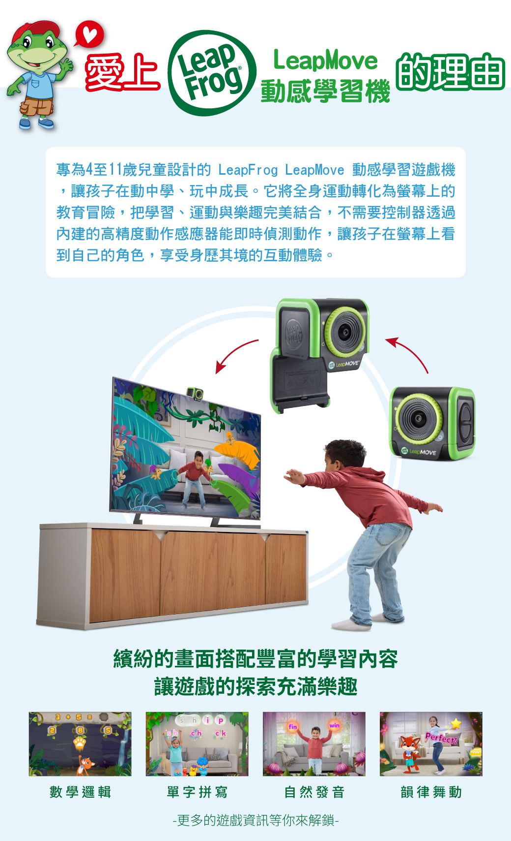 內建高精度動作感應器,可即時偵測孩子的身體動作,