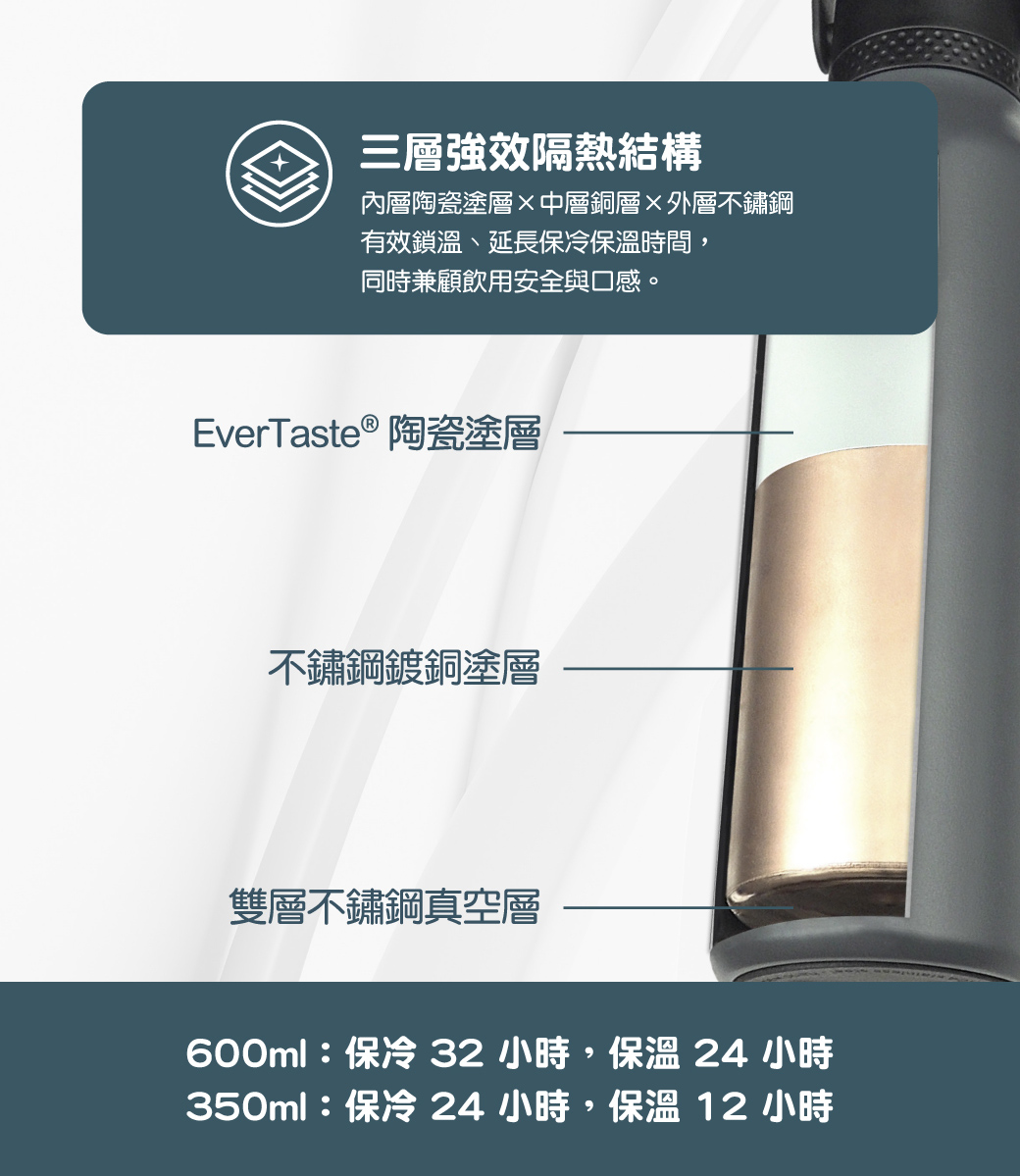 外層不鏽鋼,使冷飲可保冰長達 24 小時、熱飲保溫達 12 小時