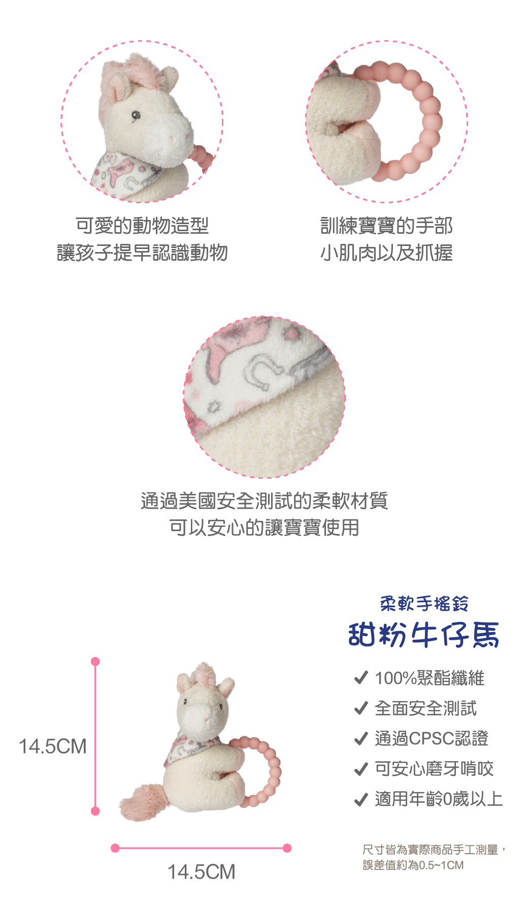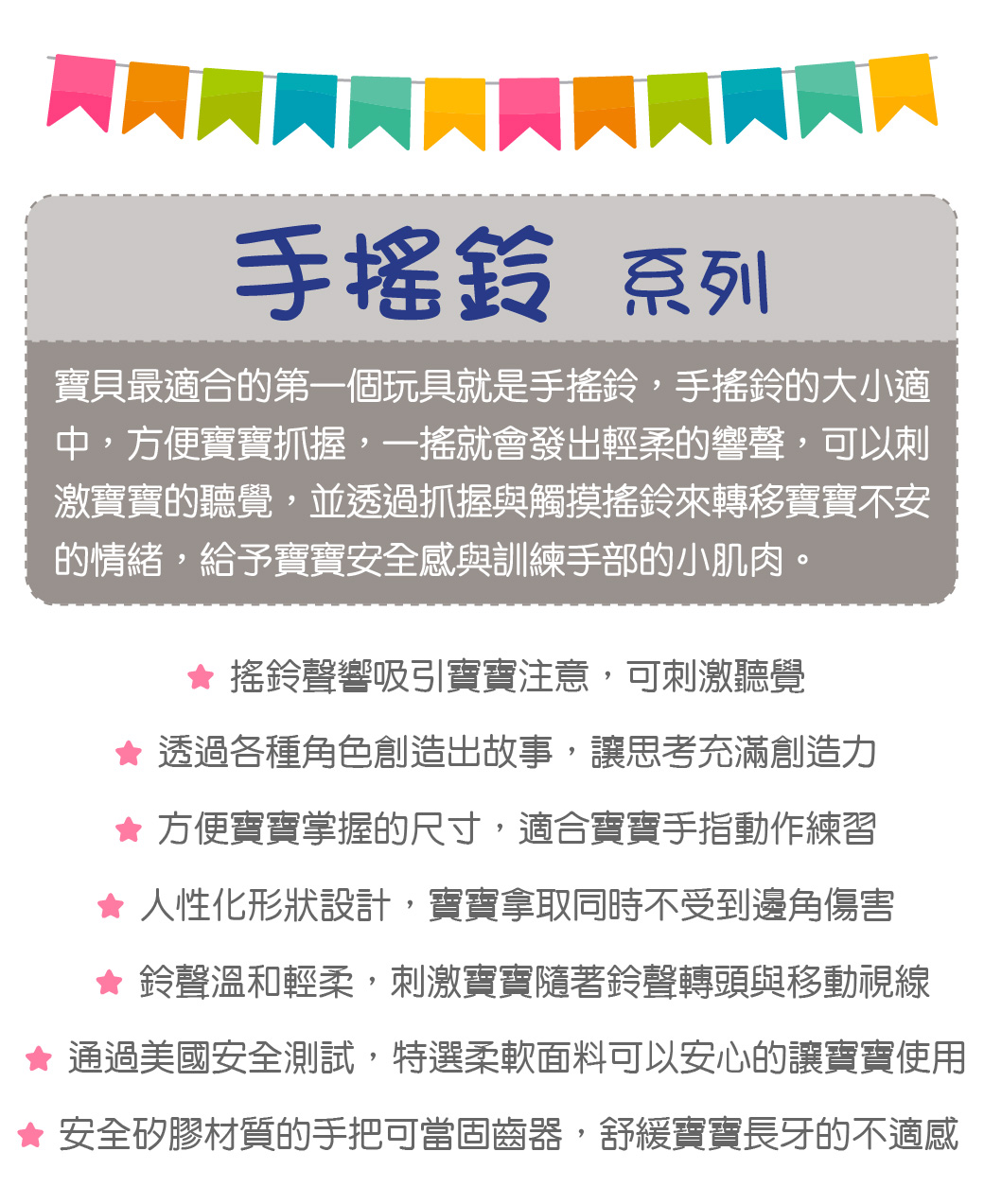 ●手搖鈴矽膠材質的手把可當固齒器,有效舒緩寶寶口慾期的口腔不適