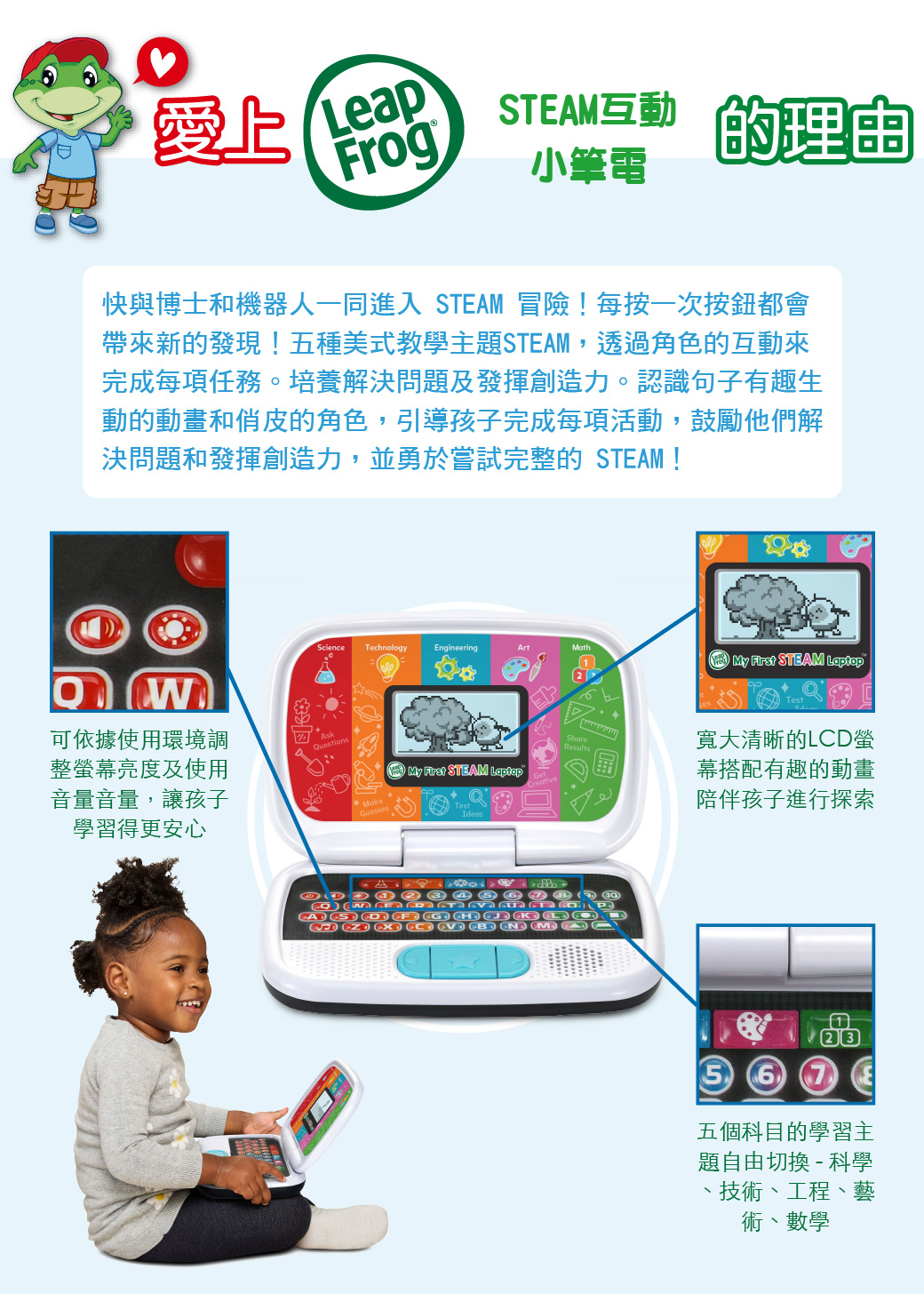 透過角色引導與按鍵互動,引領孩子完成任務挑戰,